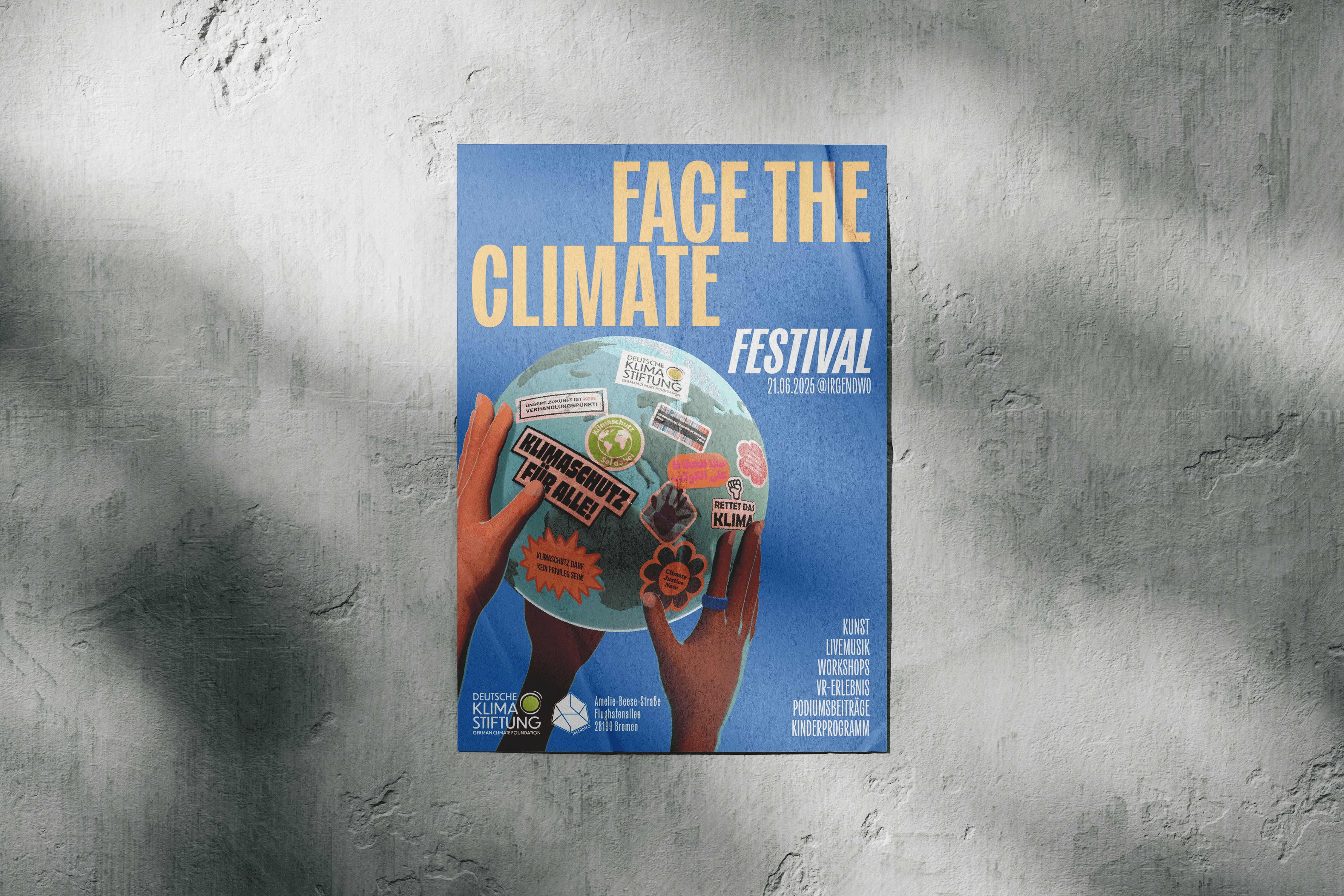 Das Festival der Deutschen Klima Stiftung in Bremen schafft Raum für Begegnung, Austausch und Perspektiven. Es zeigt: Klimagerechtigkeit hat viele Gesichter. Ob jung oder alt, aus Bremen oder von anderswo, wir alle teilen diesen Planeten und tragen Verantwortung für ihn. Hierfür entwickelte ich ein stilisiertes 3D-Keyvisual in Blender, welches ich dann für die weitere Layoutgestaltung verwenden konnte. Die Formate wurden dann für unterschiedliche Formate, wie Website, Social Media und Plakatwerbung eingesetzt.