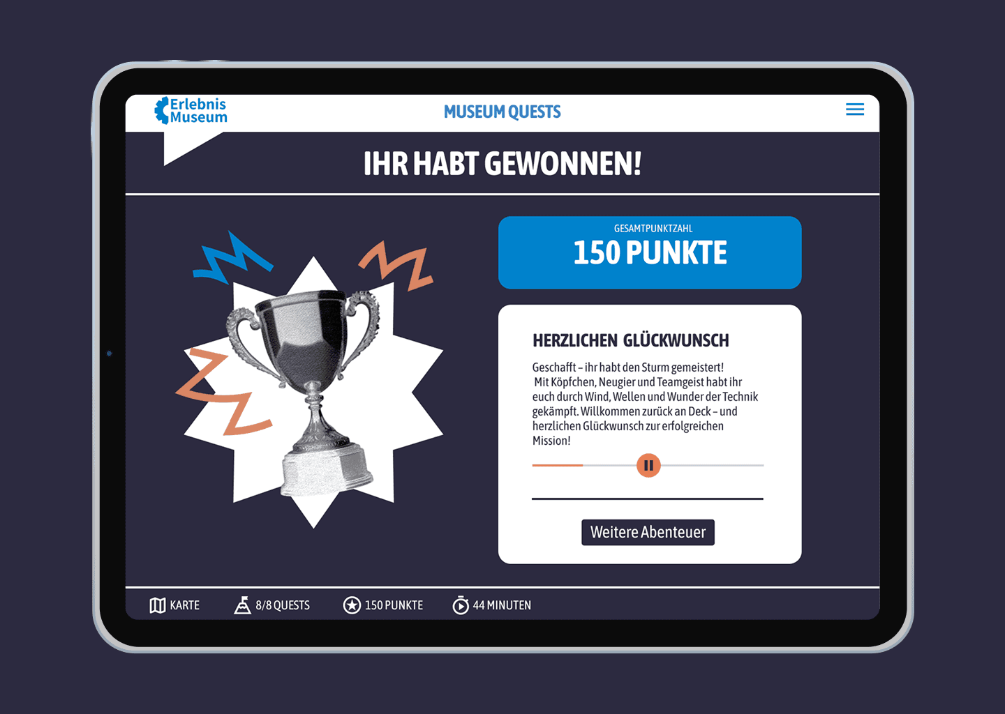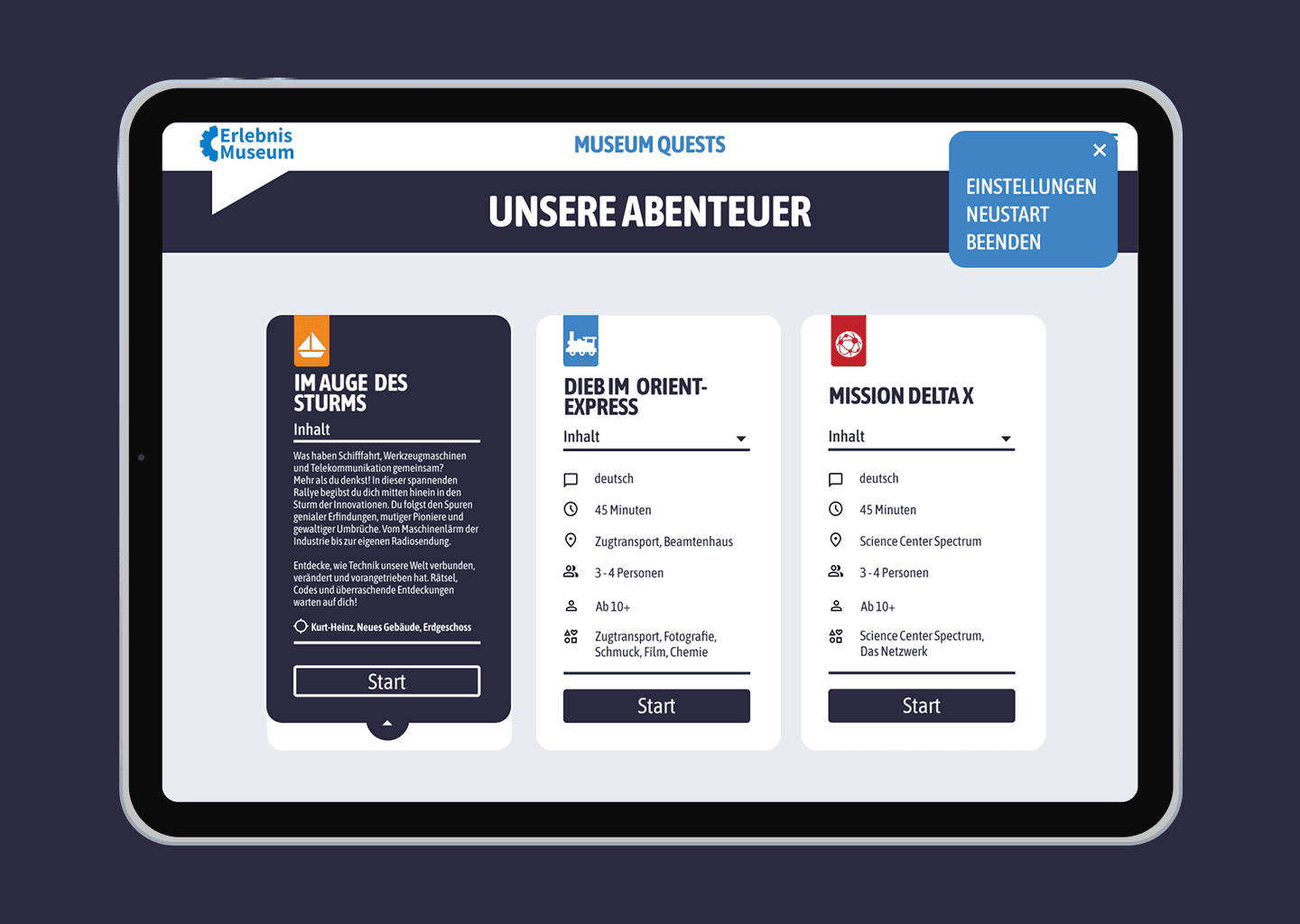 Drei individuelle Abenteuergeschichten führen die Besucher:innen auf unterschiedlichen Wegen durch das Museum – thematisch zugeschnitten, altersgerecht und interaktiv.